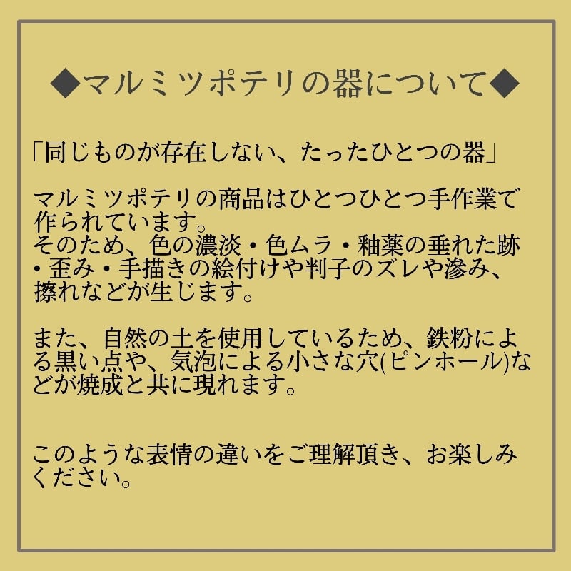 そのため、色の濃淡・色ムラ・釉薬の垂れた跡・歪み・手描きの絵付けや判子のズレや滲み、擦れなどが生じます。
