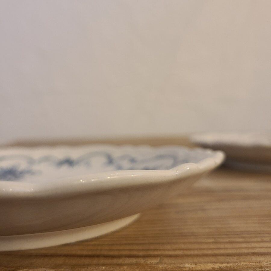そのため、色の濃淡・色ムラ・釉薬の垂れた跡・歪み・手描きの絵付けや判子のズレや滲み、擦れなどが生じます。